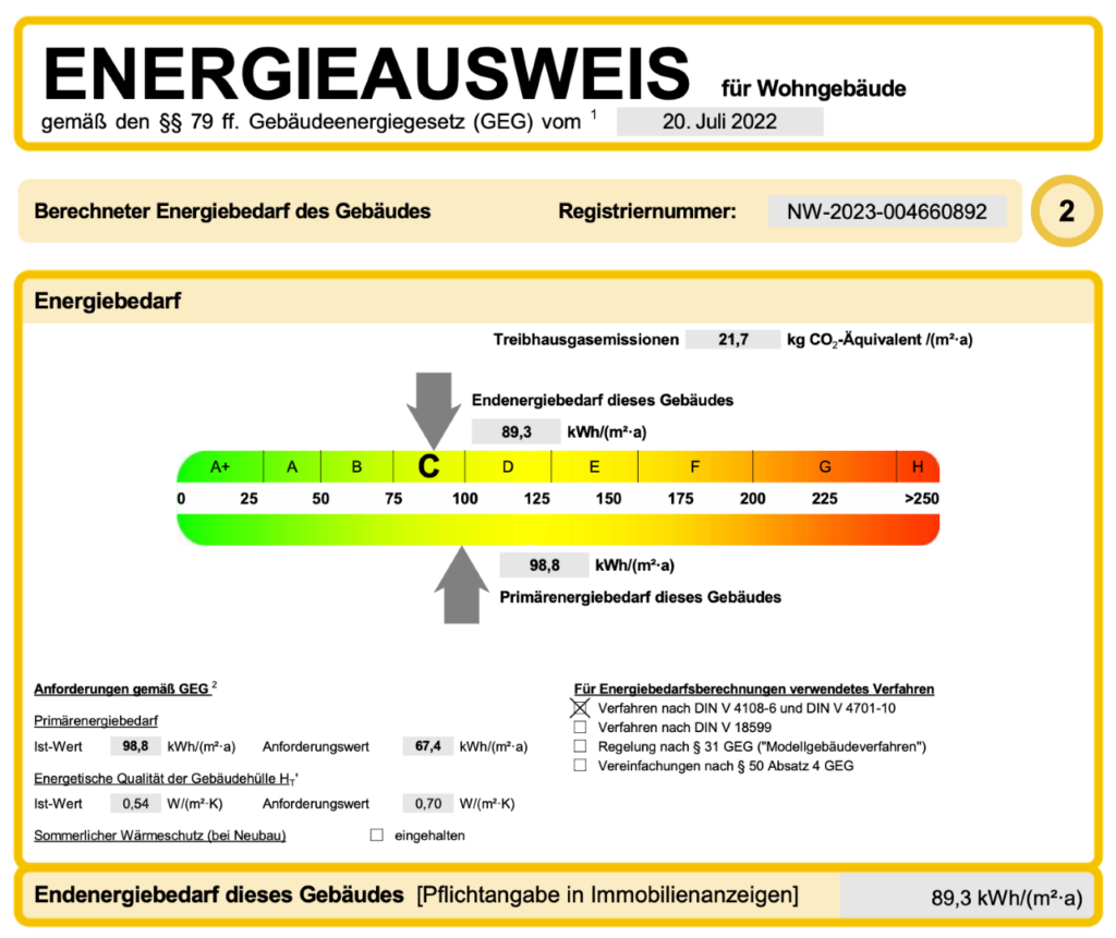Da es sich um ein neu zu errichtendes Gebäude gemäß § 80 Abs. 1 Gebäudeenergiegesetz (GEG) handelt, ist zum jetzigen Zeitpunkt noch kein Energieausweis erforderlich. Der Energieausweis wird spätestens unverzüglich nach Fertigstellung des Gebäudes erstellt und den Kaufinteressenten zur Verfügung gestellt sowie in den Anzeigen ergänzt.