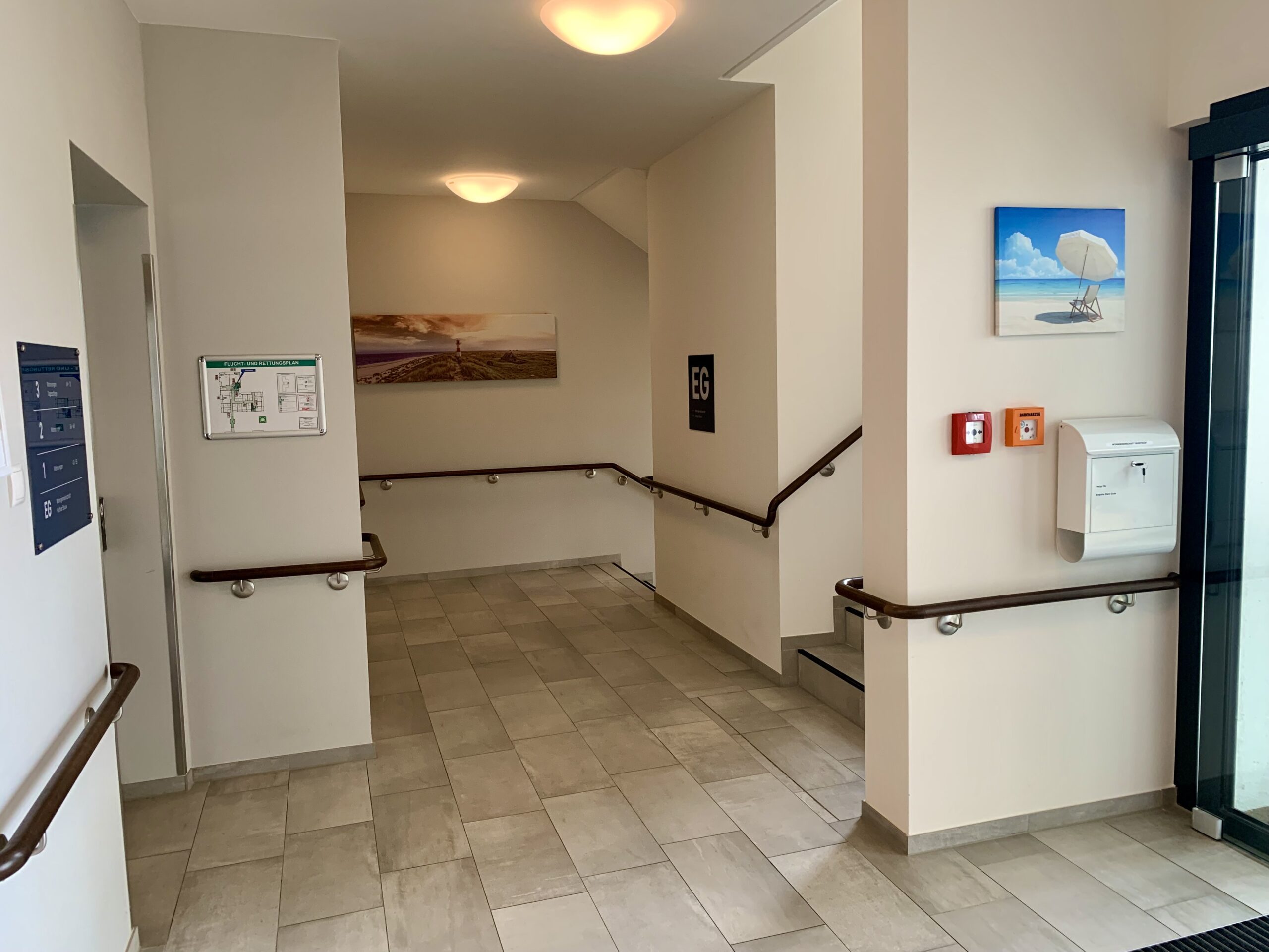 Die Anbindung der Etage ist technisch ideal gelöst. Ein großzügiger, rollstuhlgerechter Fahrstuhl verbindet den Eingangsbereich stufenlos mit den Räumlichkeiten im Obergeschoss. Dies garantiert Gästen und Besuchern einen jederzeit komfortablen Zugang. Ergänzt wird dieser Komfort durch großzügige Parkmöglichkeiten direkt am Objekt, die sowohl dem Personal als auch den Angehörigen angenehm kurze Wege ermöglichen.
