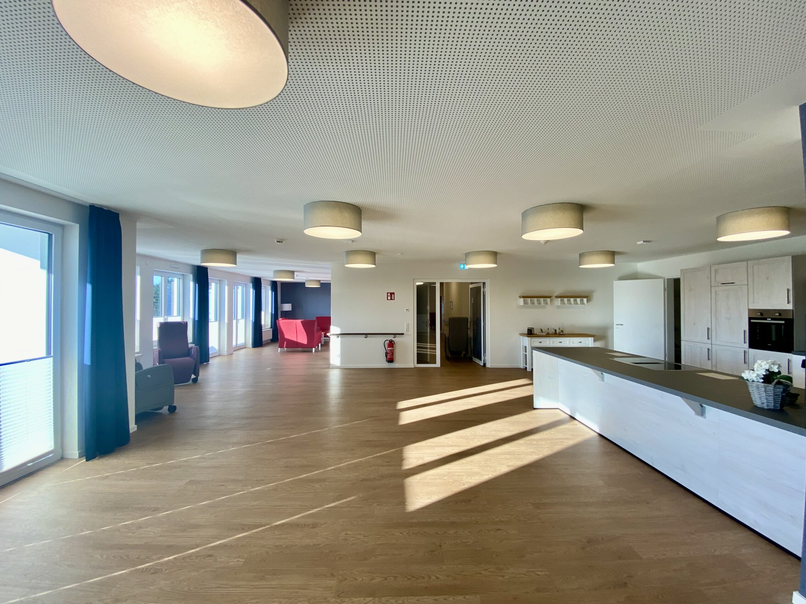 • Raumprogramm: Gemeinschaftsbereich mit offener Wohnküche, Begegnungsflächen, Therapie- und Multifunktionsräume, Pflegebad, barrierefreie Sanitäranlagen