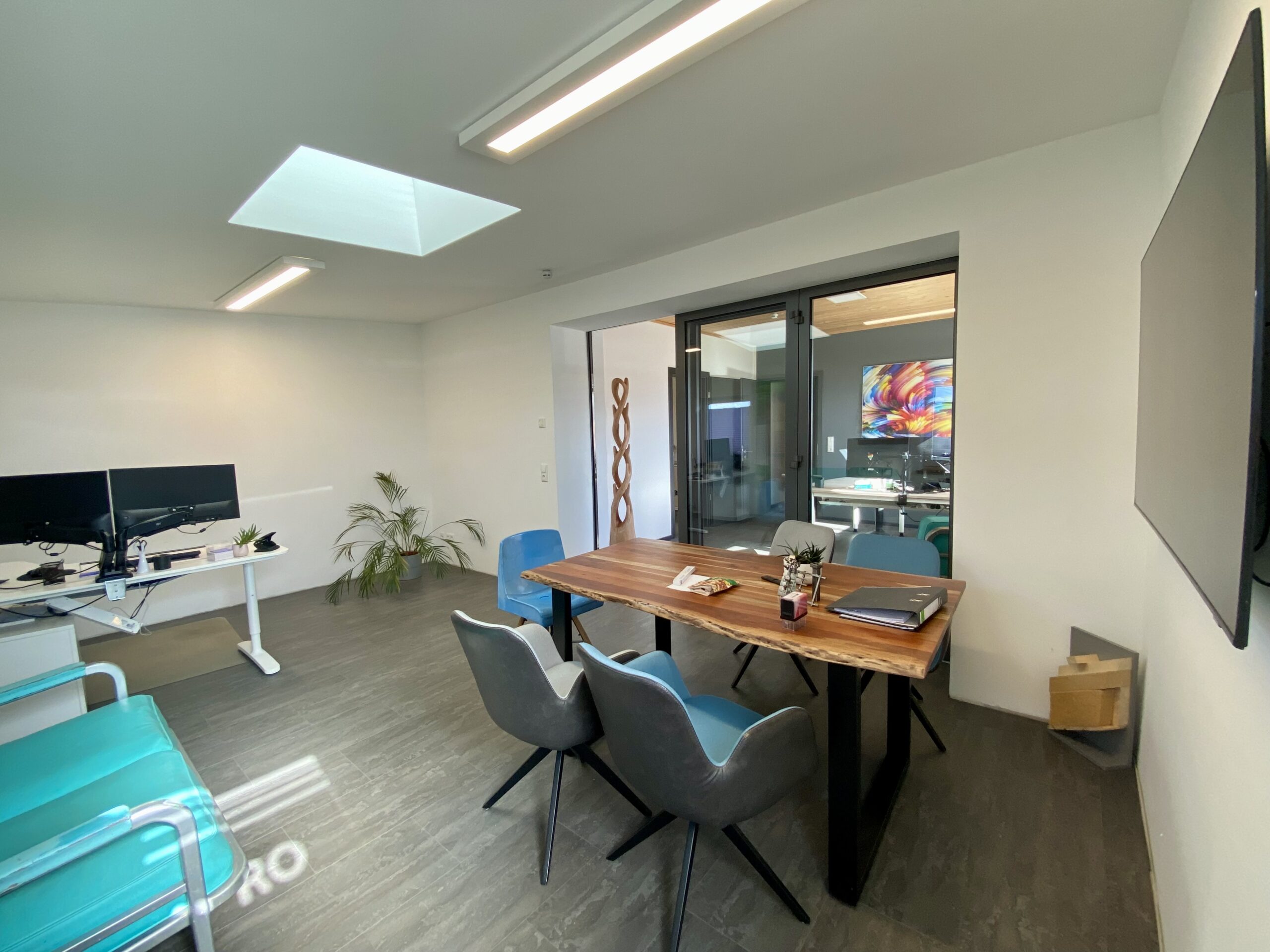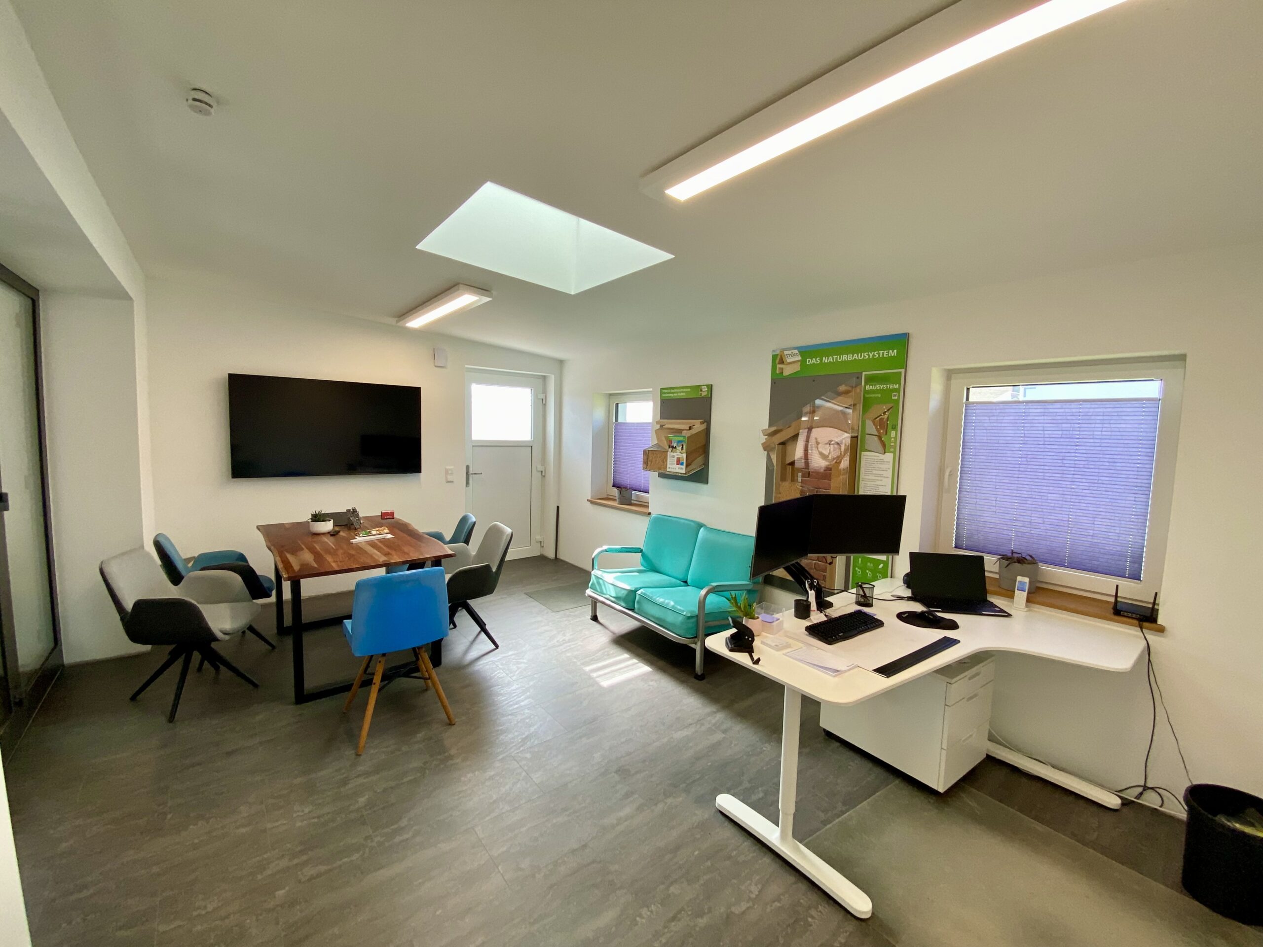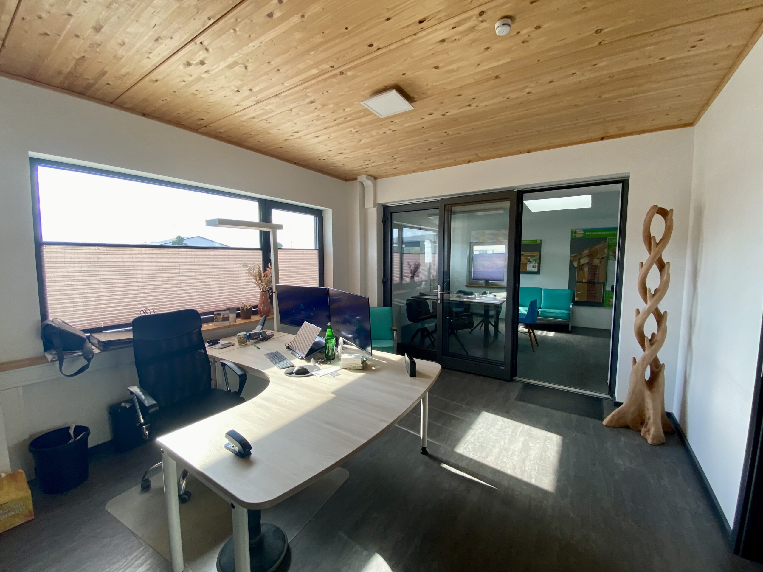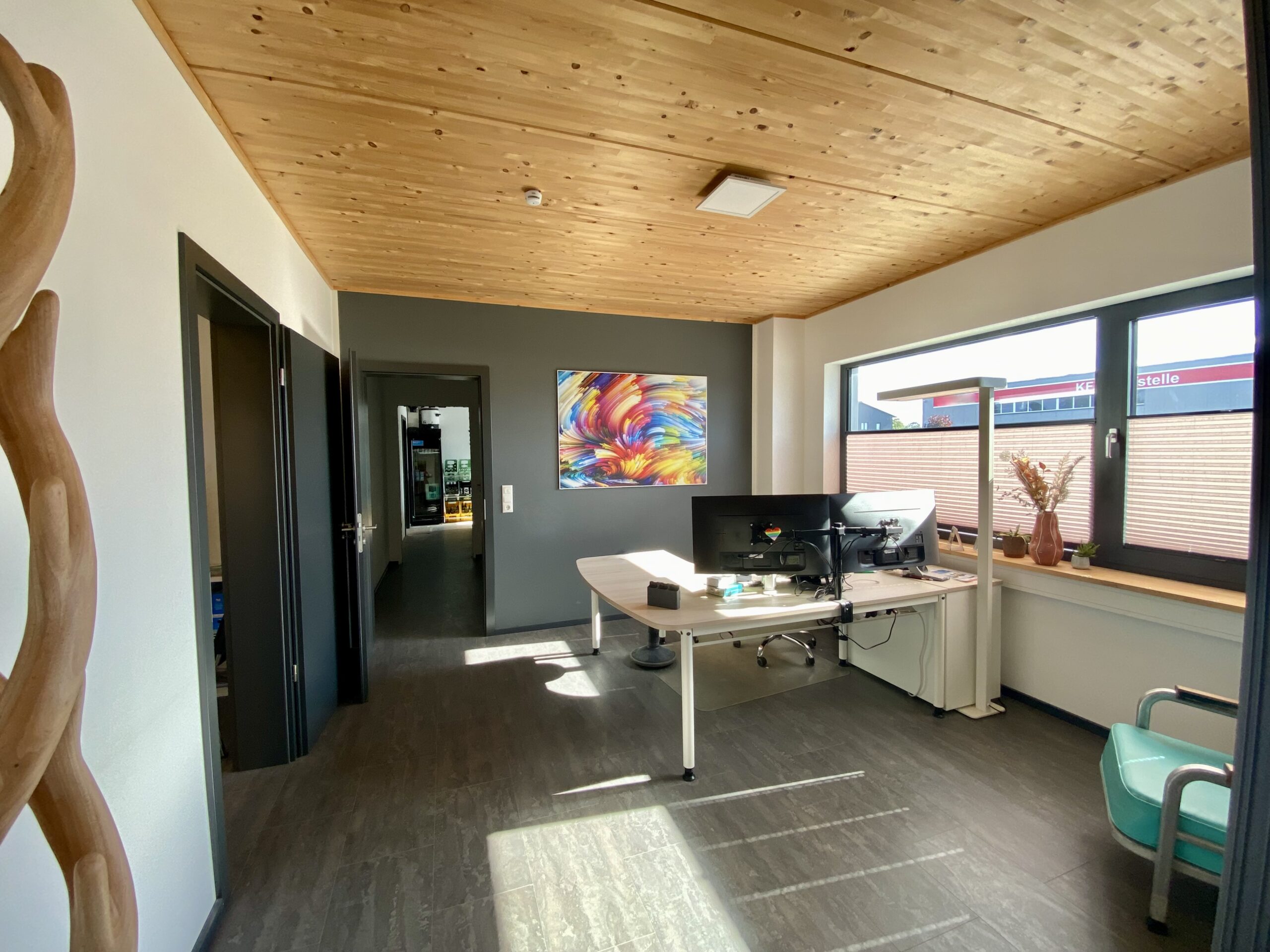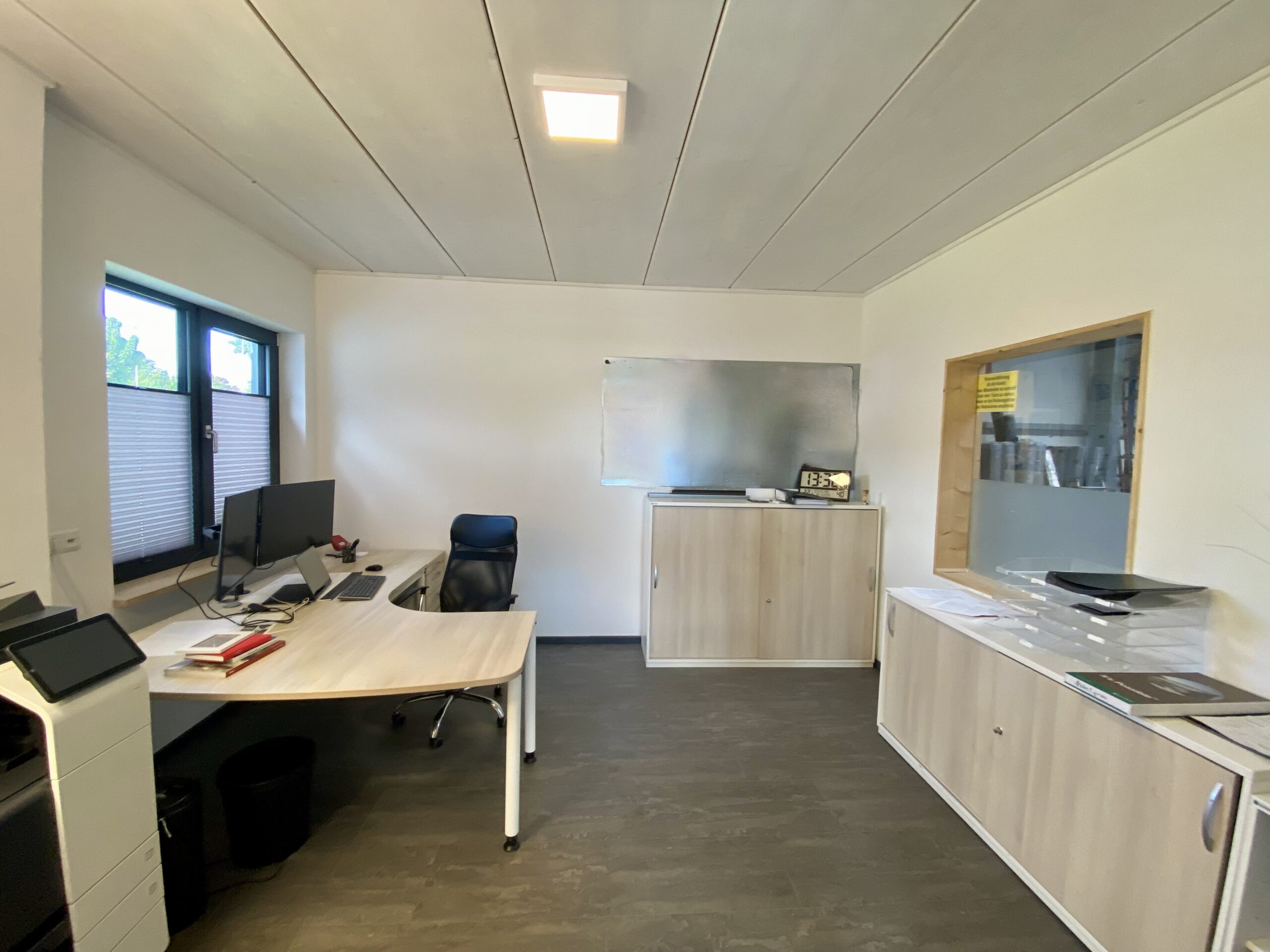 Der Bürotrakt verfügt über eine Nutzfläche von ca. 85 m2 und ist mit modernem Interior ausgestattet. Die Büroräume sind funktional geschnitten und bieten eine angenehme Arbeitsatmosphäre. Sie können flexibel als Einzel- oder Teamarbeitsplätze verwendet werden.