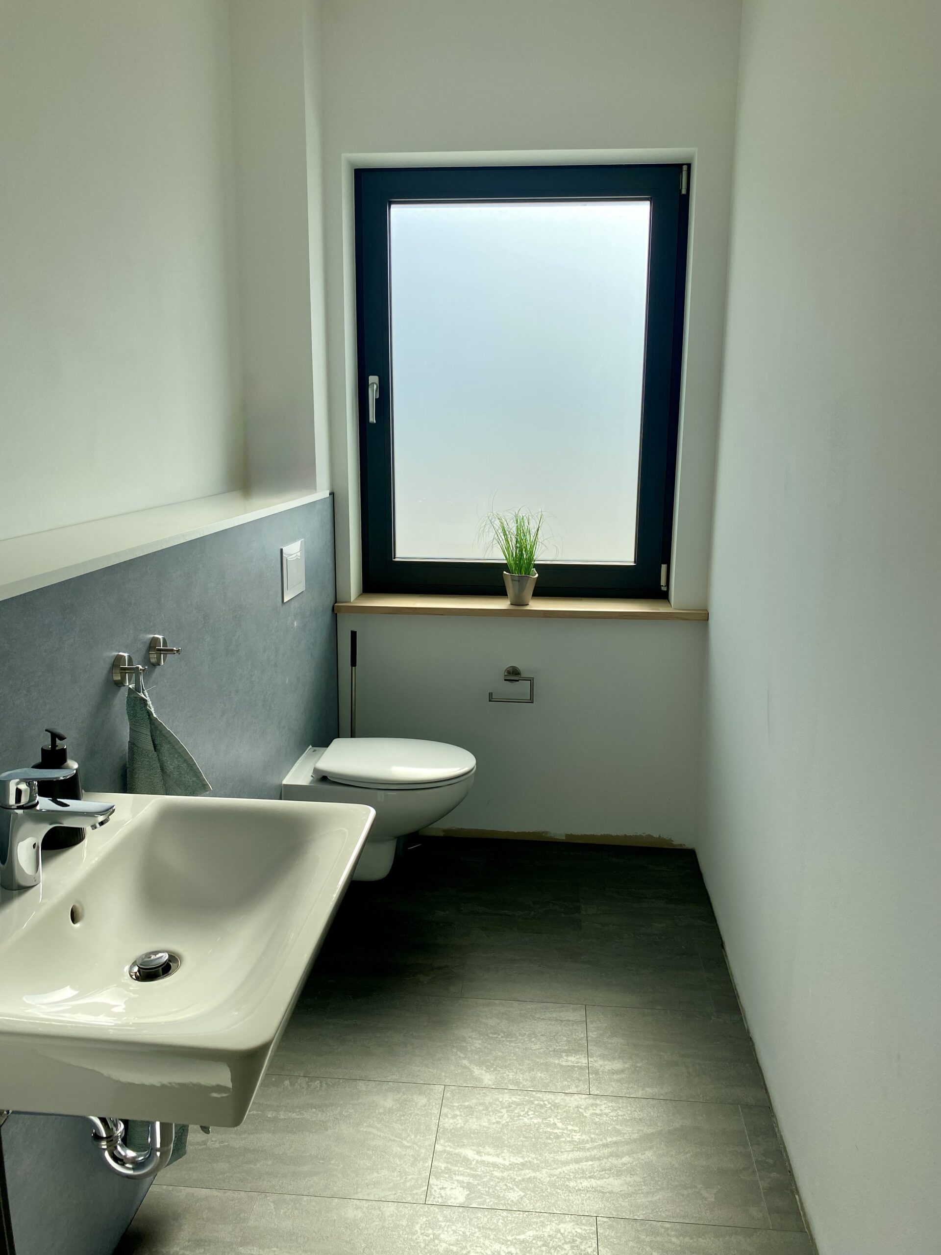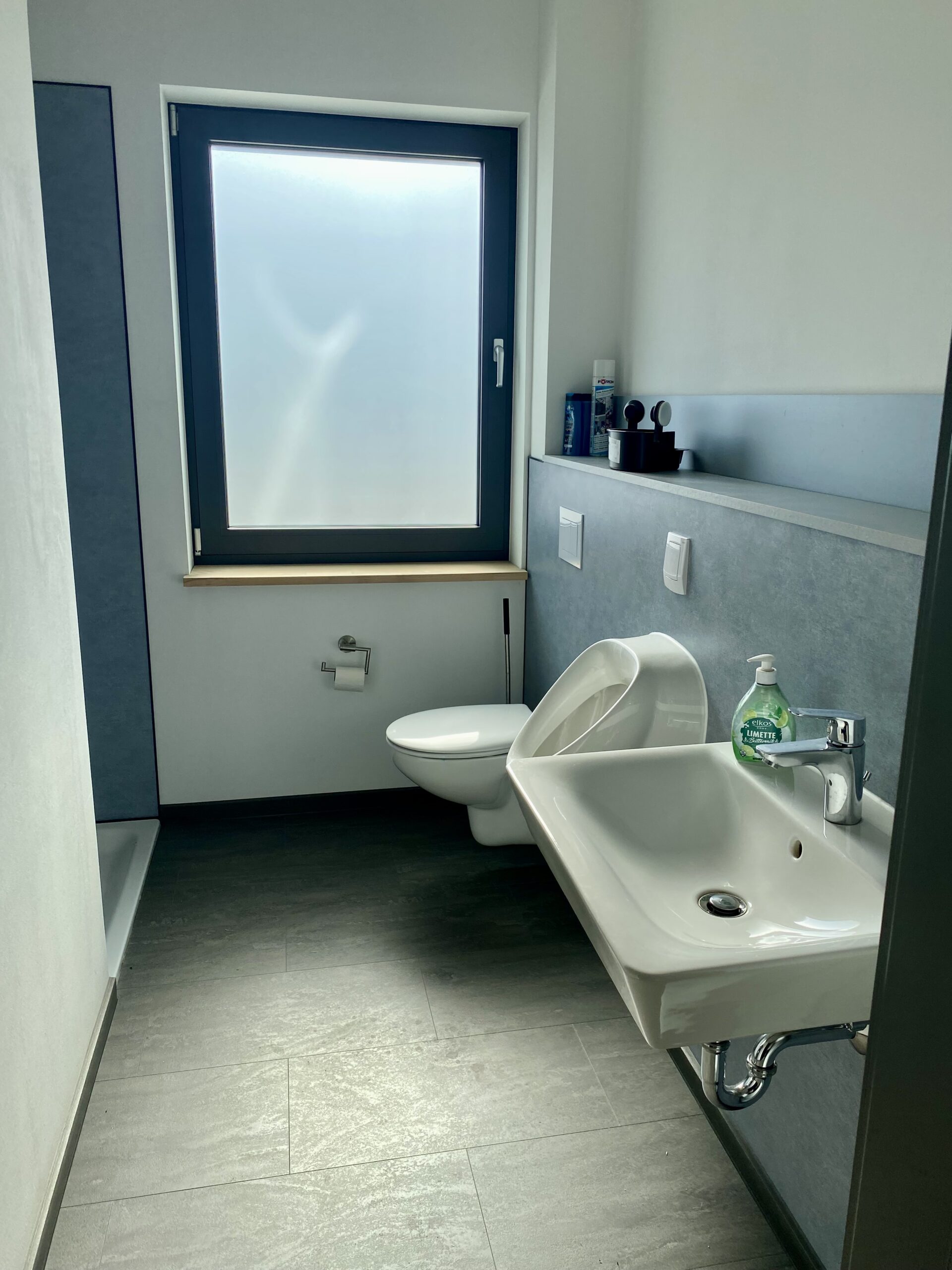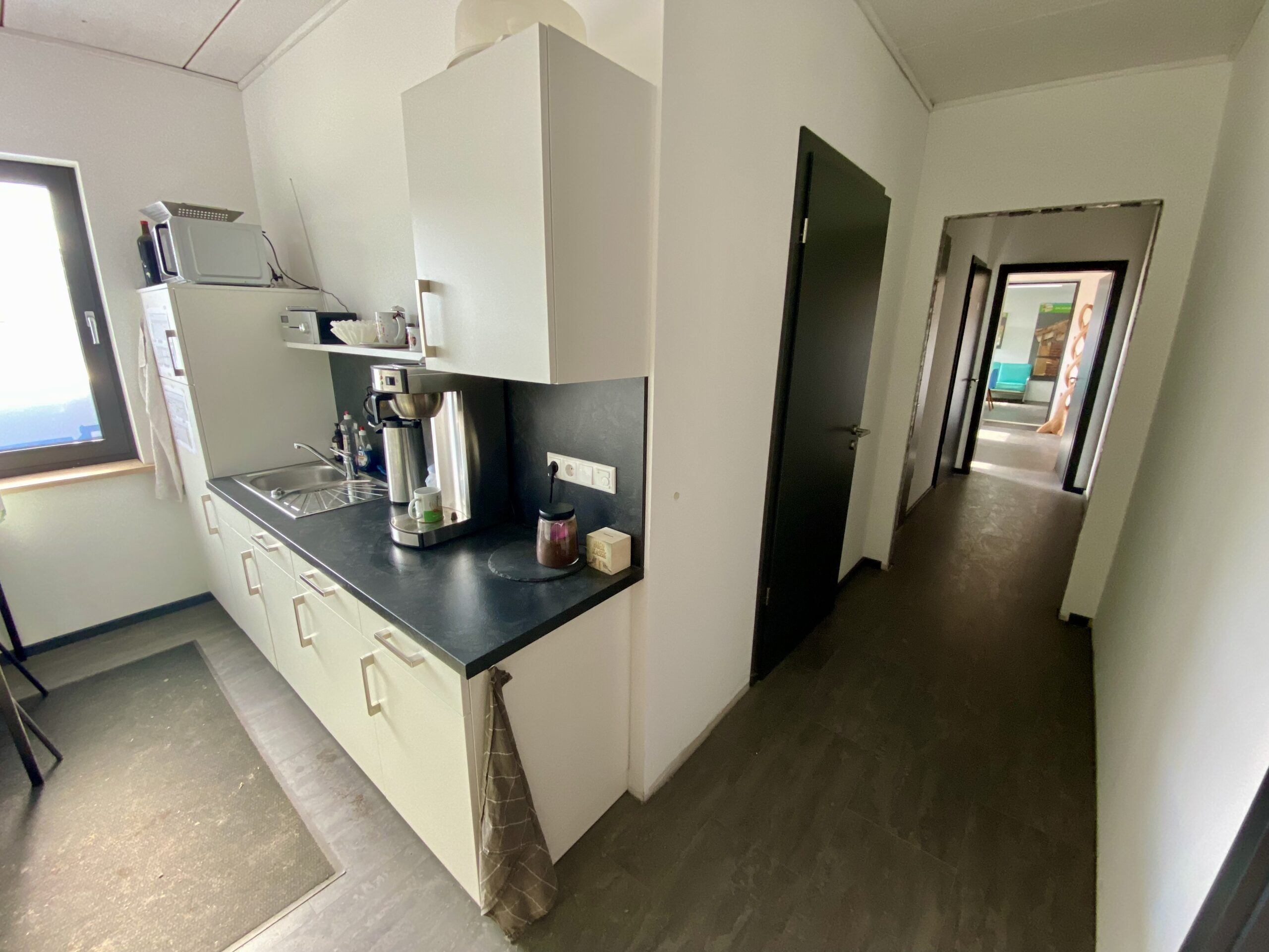 Zwei Kundentoiletten sowie ein separater Technikraum schaffen optimale Arbeitsbedingungen und klare Strukturen. Ein Aufenthaltsraum mit Küchenzeile rundet das gute Angebot im Bürotrakt ab.